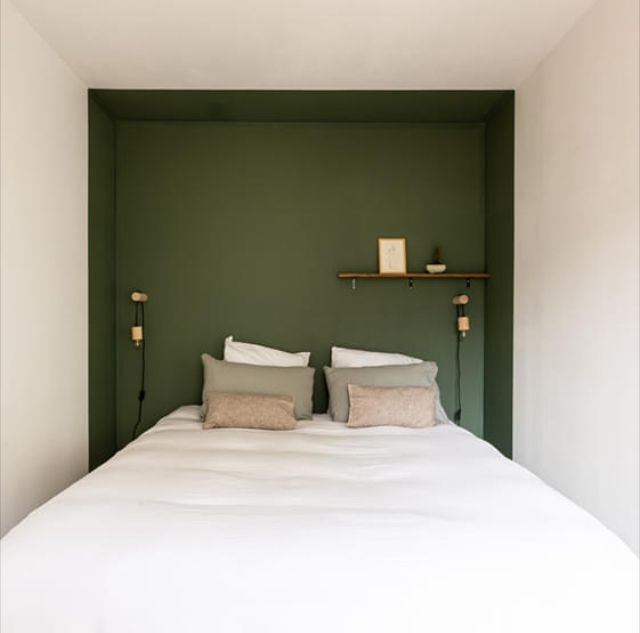 Vous pouvez également opter pour une tête de lit qui fera office de cloison avec un coin dressing ou bureau. En montant jusqu’au plafond, elle structurera la pièce en deux espaces distincts.