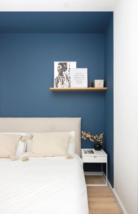 On peut choisir un vert foncé, un bleu intense ou un rouge bordeaux par exemple. Cette touche de couleur singularisera ce mur et attirera le regard pour casser la perspective.