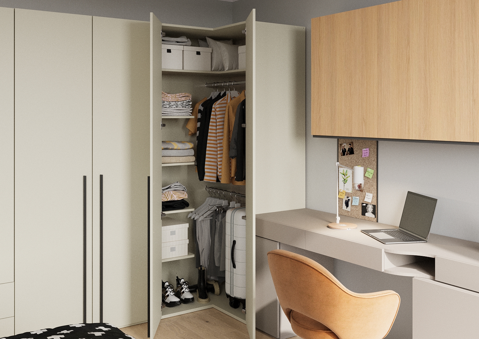 Son format d’angle libère les murs adjacents pour d’autres meubles essentiels comme un bureau, un lit ou une commode. Elle offre ainsi une solution gain de place efficace, combinant forte capacité de rangement et encombrement réduit, idéale pour créer une chambre fonctionnelle et bien ordonnée.