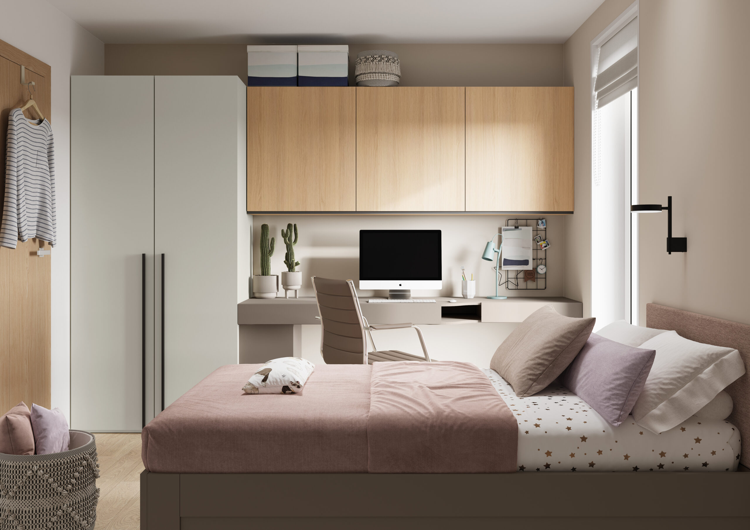 Compacte mais esthétique, cette armoire 2 portes de 101 cm devient un élément structurant de la chambre d’ado. Son design minimaliste lui permet de se fondre discrètement tout en mettant en valeur l’organisation et la modernité de la pièce.