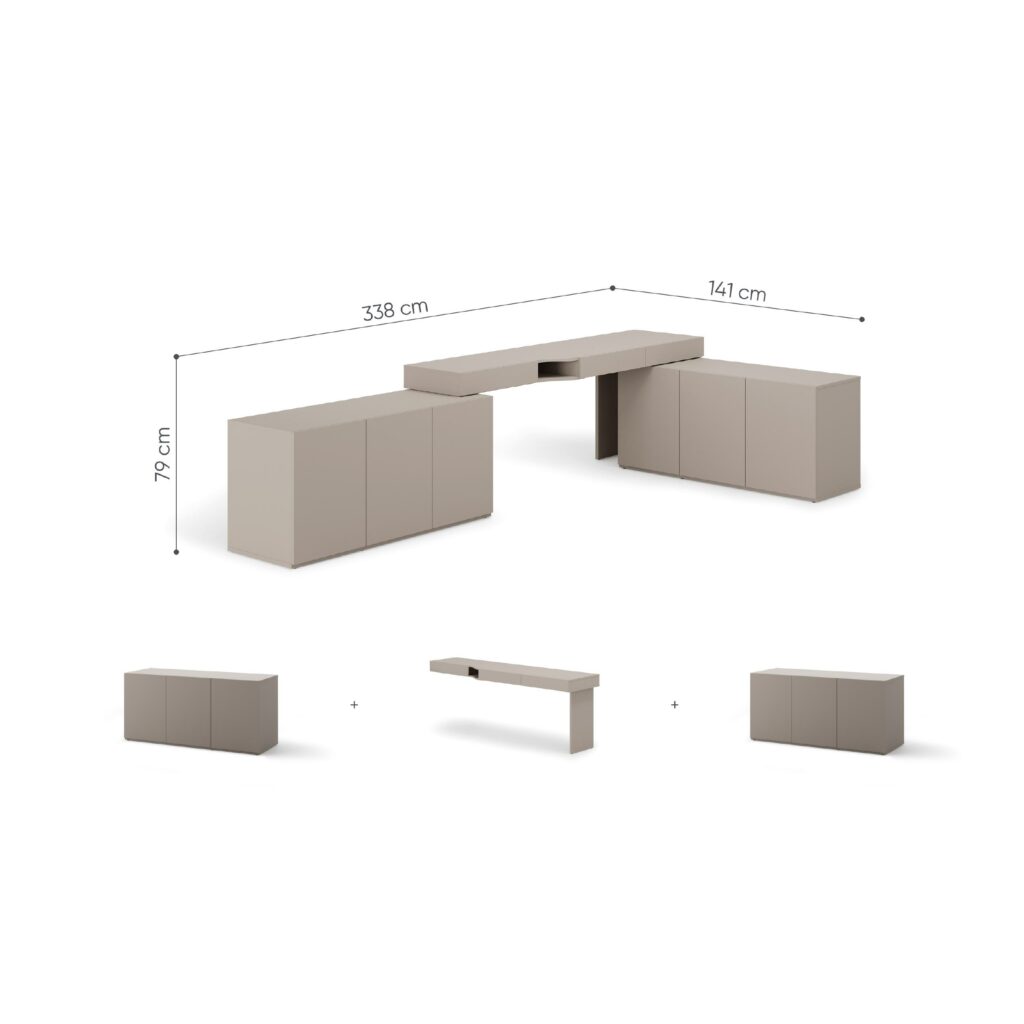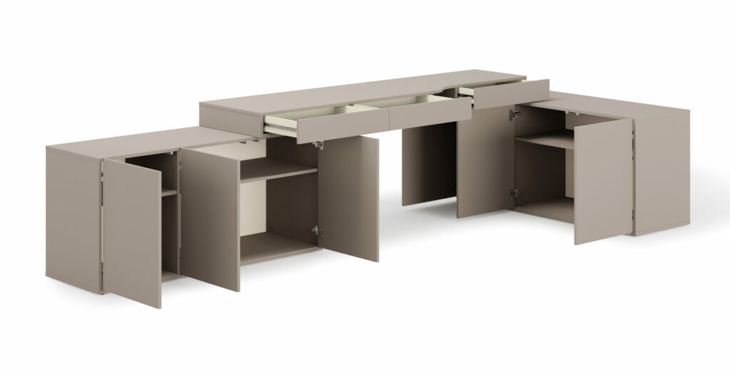 Le bureau avec 2 rangements intégrées – MANON est un meuble multifonction conçu pour répondre aux besoins des adolescents en termes de travail, de rangement et de gain de place. Il associe un grand plateau de travail de 211 cm en finition gris taupe élégante à deux commodes intégrées, positionnées de chaque côté. Cette configuration permet de créer un espace ergonomique et parfaitement organisé au quotidien.