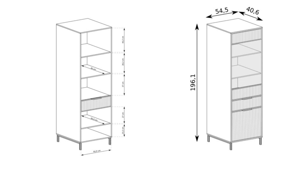 La Vitrine KELLY se démarque par son design équilibré, avec des pieds en métal noir de 12 cm qui ajoutent une touche de modernité tout en assurant une stabilité et une robustesse accrues. Les matériaux utilisés, tels que le panneau de meuble stratifié de 18 mm pour le corps et le panneau MDF de 18 mm pour les façades, garantissent la durabilité et la longévité du meuble. Le placage ABS des bordures et le panneau HDF pour l’arrière de l’armoire contribuent également à sa solidité et à sa résistance à l’usure quotidienne.
