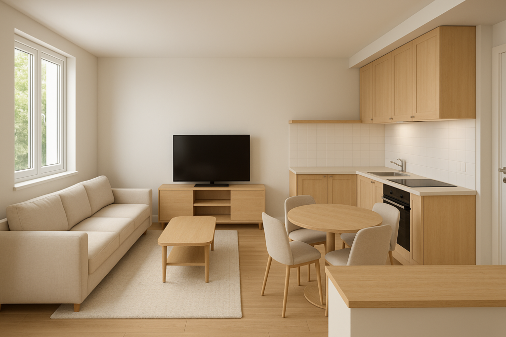 Pour un agencement réussi sur 25m², délimitez clairement la zone cuisine/repas de la zone salon. Optez pour une cuisine en L, une table ronde pour la transition, un canapé d’angle contre un mur pour maximiser l’espace, et des meubles de rangement multifonctions.